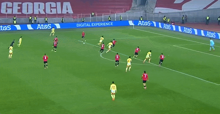 Phút thứ 7 của trận đấu, Torres đột phá trong khu vực ba giây để chuyền bóng vào vòng cấm, khiến Goholishvili để chơi bóng ném. Tây Ban Nha do đó có được cơ hội ở cự ly 12m. Ovasabal sau đó thực hiện quả phạt đền ở cự ly 12m và ghi bàn thắng đầu tiên. Phút 34, Torres bước lên nhận đường chuyền ngang của Oyarzabal rồi sút vào góc xa, giúp Tây Ban Nha kéo dài tỷ số lên 3-0.