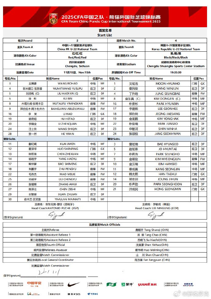 Đội hình xuất phát bóng đá quốc gia U22: 16-Li Hao, 4-Wumitijiang, 5-Liu Haofan, 19-Hu Hetao, 24-Wang Shiqin, 28-He Yiran, 3-Wang Bohao, 6-Xu Bin, 20- Li Zhenquan, 8-Muta Lipu, 9-Baihe Lamu