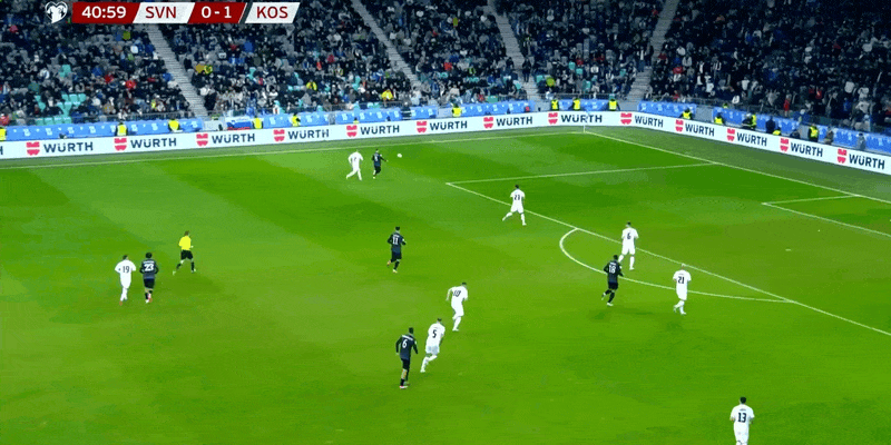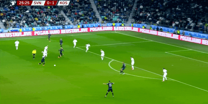 11'Hậu vệ Kosovo phạm lỗi phá bóng, cú sút của Vipotnik bị cản phá