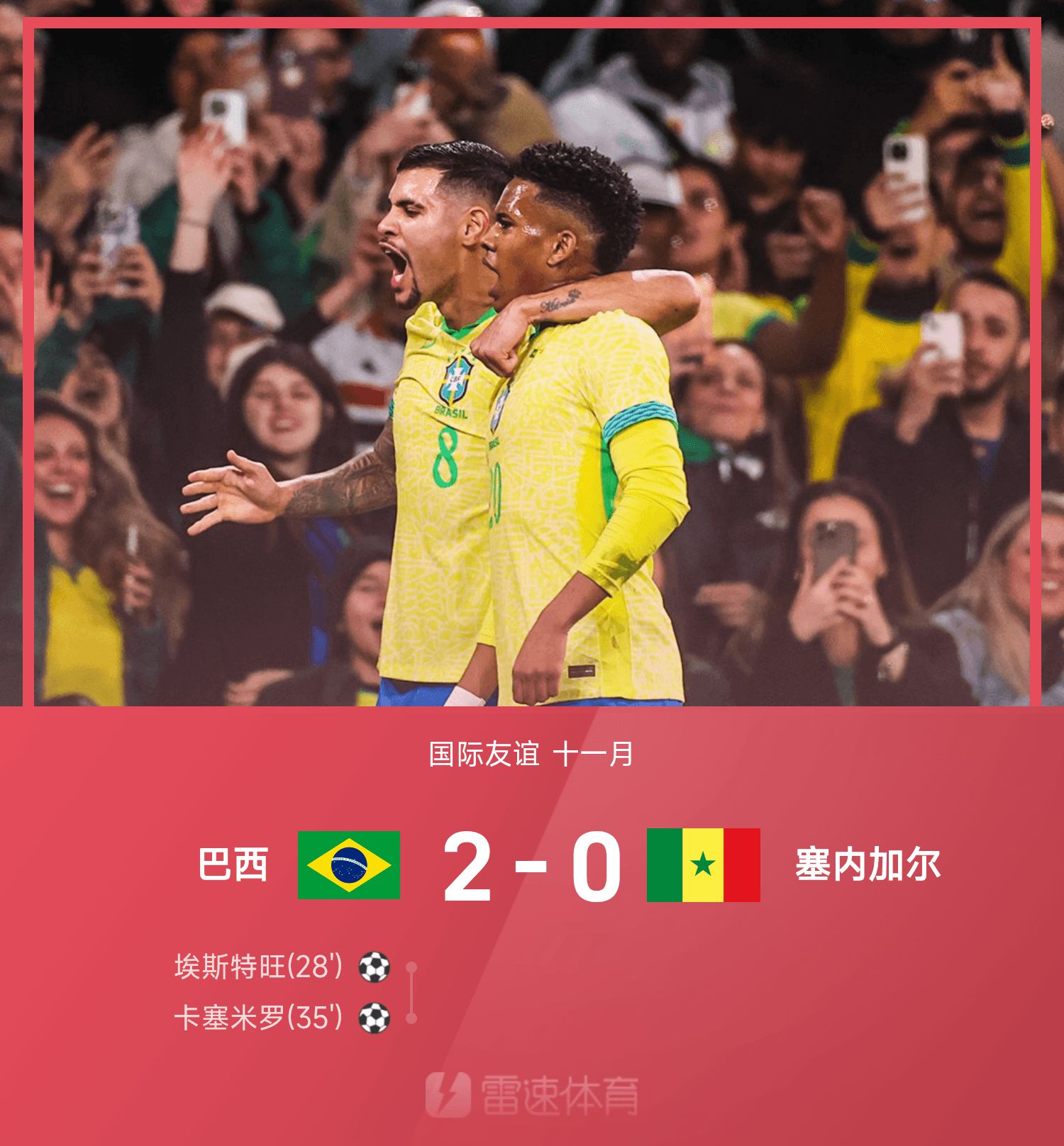 6686 Thể thao ngày 16 tháng 11 Trong mùa giải giao hữu quốc tế lần thứ 25 vào tháng 11, Brazil đã đánh bại Senegal 2-0. Trong hiệp một, Esteban dứt điểm rất mạnh từ cánh phải, Casemiro tận dụng sai cơ hội của đối thủ để ghi bàn. Sang hiệp hai, không bên nào ghi được bàn thắng nào và Gabriel phải rời sân vì chấn thương.