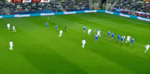 16' Cú đá phạt trực tiếp của Bắc Ireland đi vào khu vực 3 giây, cầu thủ ở cự ly 12m không bóng