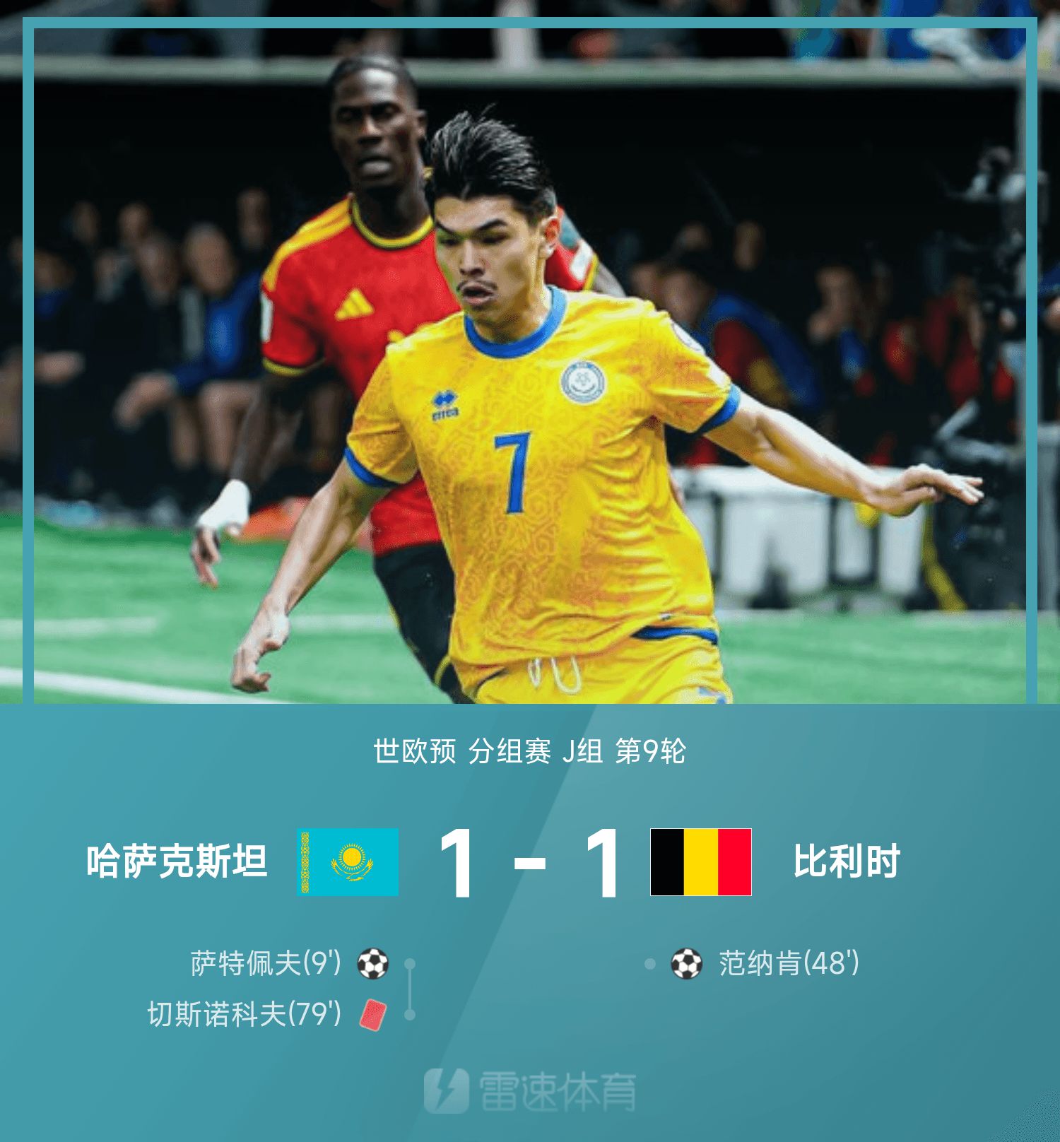 6686 Sports đưa tin ngày 15/11 rằng ở lượt 9 bảng J Vòng loại khu vực châu Âu lần thứ 26, Kazakhstan đã hòa Bỉ với tỷ số 1-1. Trong nửa đầu trận đấu, Satepev tận dụng cơ hội của Tate để ghi một bàn duy nhất. Sang hiệp 2, Vannaken đánh đầu ghi bàn gỡ hòa. Sau đó, Bỉ tung ra đòn tấn công quyết liệt và Chesnokov trong thẻ đỏ nhưng tỷ số 1-1 được giữ nguyên đến cuối trận, khiến Bỉ bỏ lỡ cơ hội tiến tới World Cup.