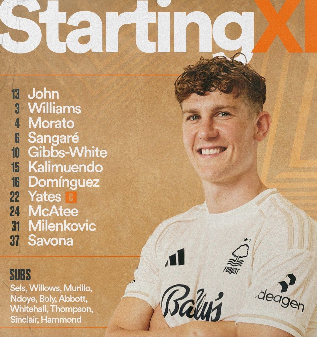 Đội hình xuất phát của Nottingham Forest: 13-Victor, 31-Milenkovic, 3-Williams, 4-Morato, 37-Savona, 6-Sangare, 22-Yates, 10-White, 16-Dominguez, 24-McCarty, 1 5-Cali Muendo