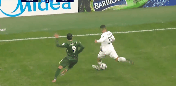 42’ Zhang Yuning bị đối thủ rê bóng dưới háng làm nhục, Fabio đẩy đối thủ cho đồng đội
