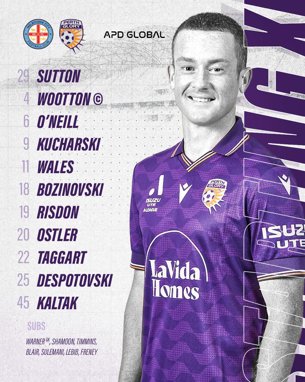 Đội hình xuất phát của Perth Glory: 29-Sutton, 19-Risden, 4-Wooton, 11-Wells, 45-Karl Tucker, 20-Osterler, 6-O'Neill, 9-Kuchalski, 18-Boznovsky, 2 5-Despotovsky, 22-Taggart