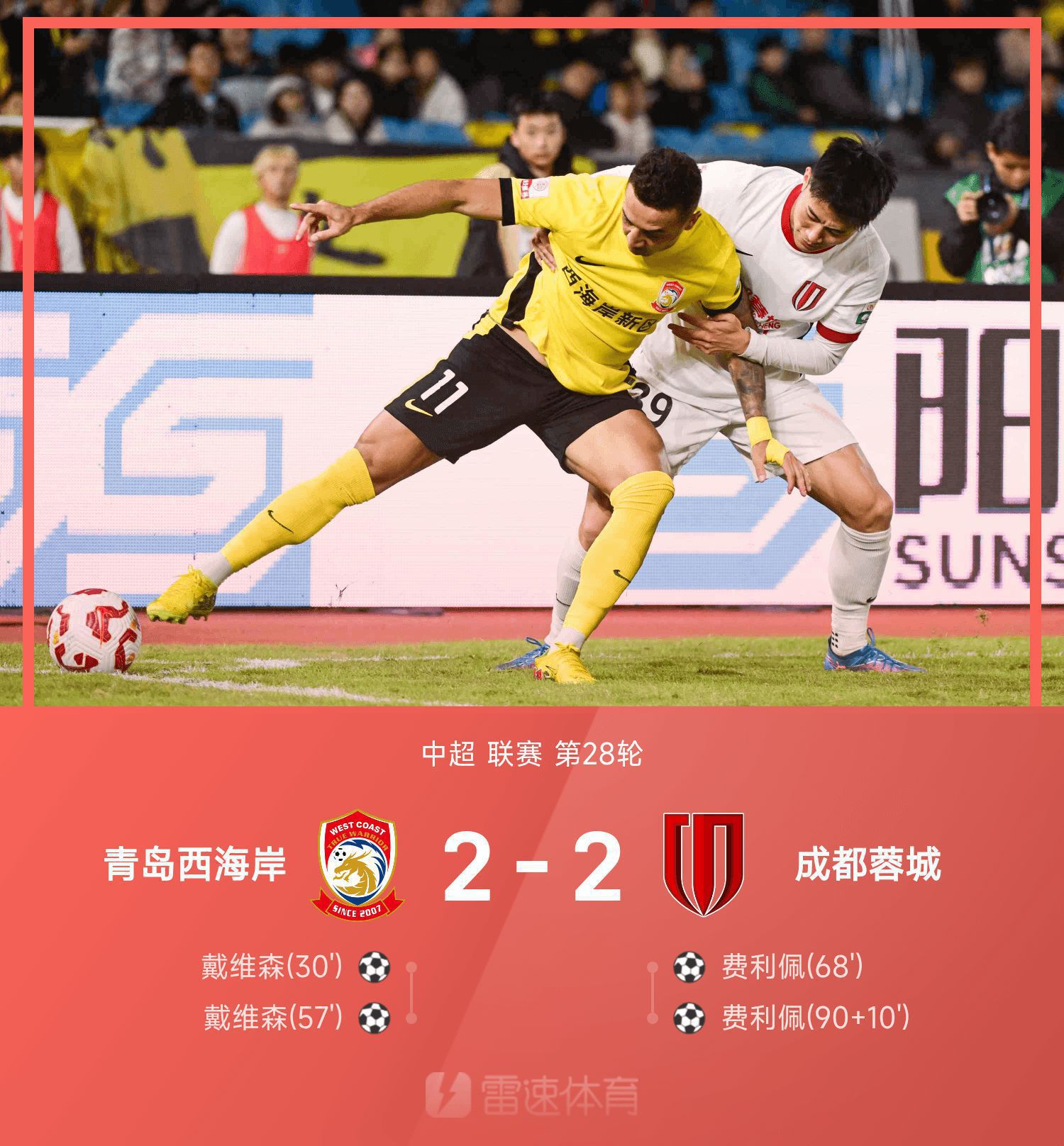 6686 Thể thao ngày 26 tháng 10 Ở vòng 28 giải Chinese Super League lần thứ 25, Thanh Đảo West Coast đối đầu Thành Đô Thành Đô trên sân nhà của đội chủ nhà. Phút 30, Delgado mắc sai lầm ở phần sân sau và Aziz kiến tạo cho Davidson ghi bàn. Phút 57, Gurfinkel mắc lỗi chuyền bóng ở giữa sân. Aziz lại phản công và kiến tạo cho Davidson mở rộng tỷ số. Bờ Tây Thanh Đảo dẫn trước 2-0. Phút 68, Romulo kiến tạo cho Felipe đánh đầu từ đường biên và ghi bàn thắng. Vào thời gian bù giờ của trận đấu, bàn thắng của Chu Định Dương trong trận hỗn chiến bị coi là không hợp lệ do lỗi việt vị. Phút bù giờ thứ 10, Han Pengfei kiến tạo cho Felipe gỡ hòa trong thời gian đếm ngược cận chiến. Chung cuộc, Qingdao West Coast hòa 2-2 với Thành Đô Thành Đô trên sân nhà.
