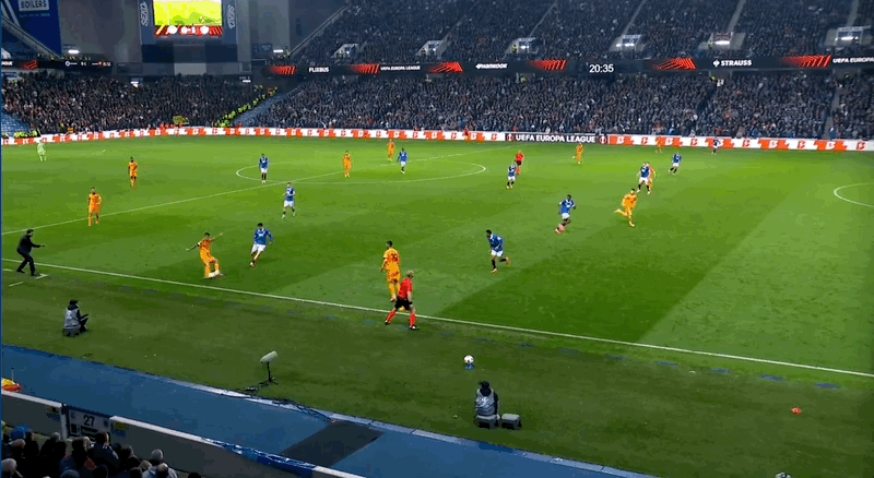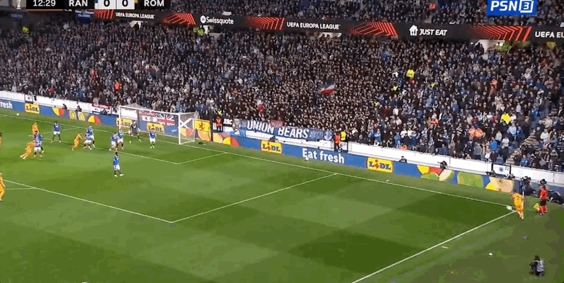 22' Sule tung cú sút từ bên ngoài, và thủ môn của Rangers đã cản phá được bóng từ vạch cuối sân