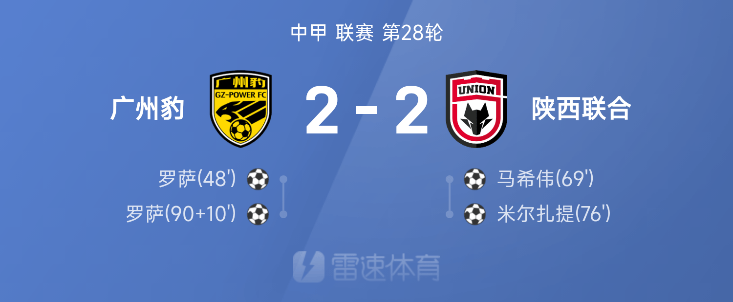 6686 Thể thao ngày 26 tháng 10 Ở vòng 28 giải Chinese League One lần thứ 25, Quảng Châu Leopards đã hòa Shaanxi United với tỷ số 2-2. Trong cả trận, Rosa ghi hai bàn, trong khi Ma Xiwei và Mirzati ghi bàn.