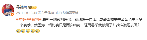 6686 Tin tức thể thao ngày 6 tháng 11, phóng viên thể thao Ma Dexing cho biết trên mạng xã hội rằng mùa giải chăm chỉ của Thành Đô Thành Đô đã bị hủy hoại bởi hai phán đoán sai lầm.