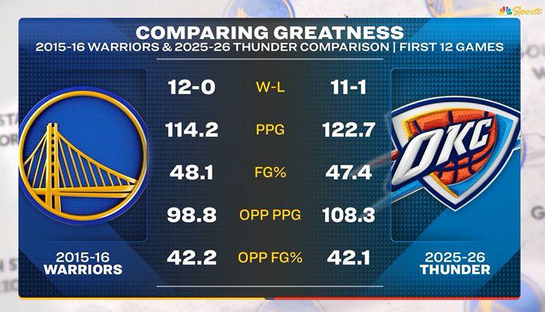 Sau trận đấu, các đài truyền hình Mỹ đã so sánh số liệu thống kê 12 trận đầu tiên của Thunder và Warriors 2015-16 mùa này: