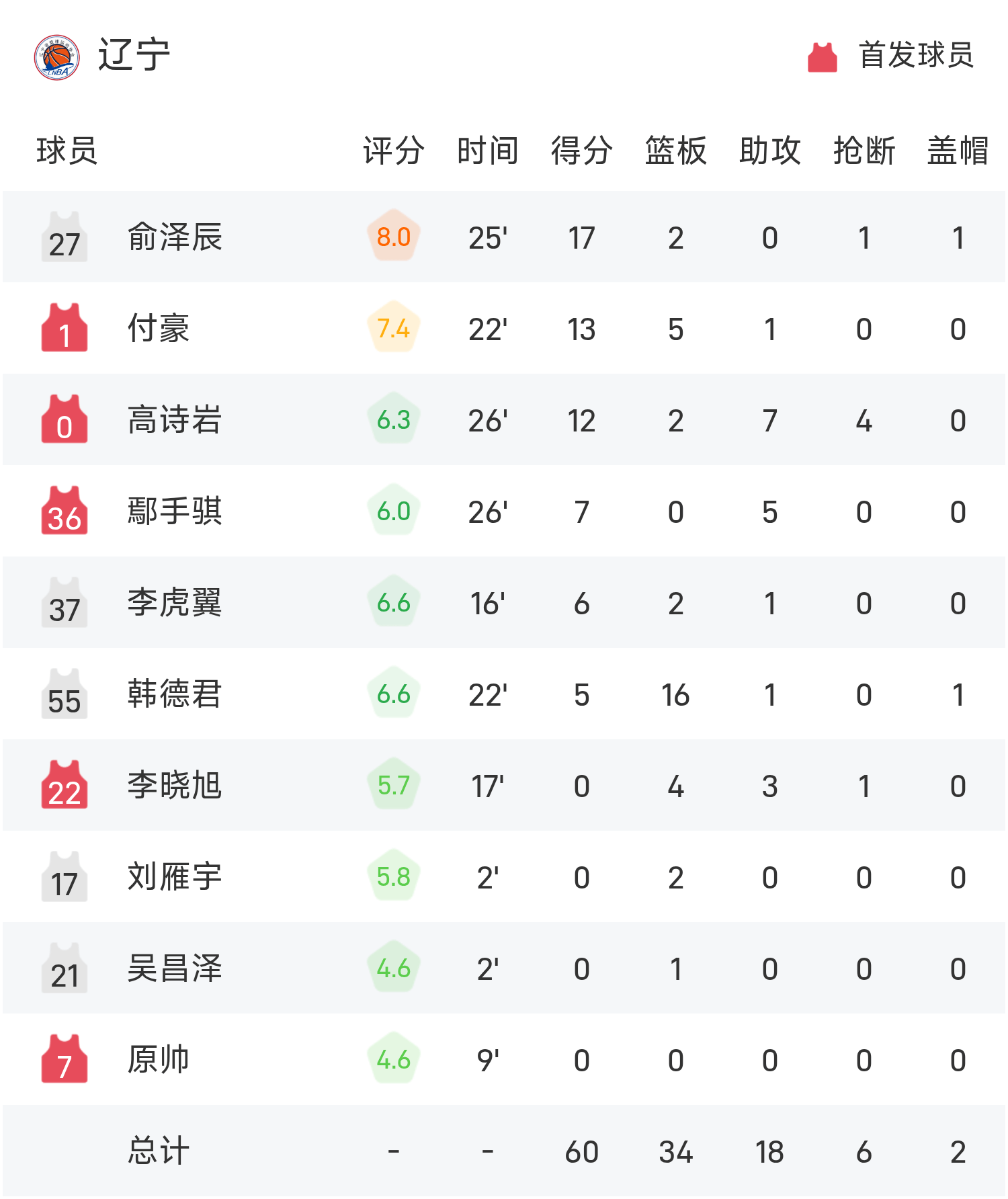Zhou Qi ghi 16 điểm, 13 rebound và 1 kiến tạo để dẫn dắt đội đến chiến thắng. Yu Zechenkong ghi được 17 điểm cao nhất trận và 2 rebound. Cầu thủ kỳ cựu Han Dejun mở màn điệu nhảy cuối cùng và giành được 16 rebound.