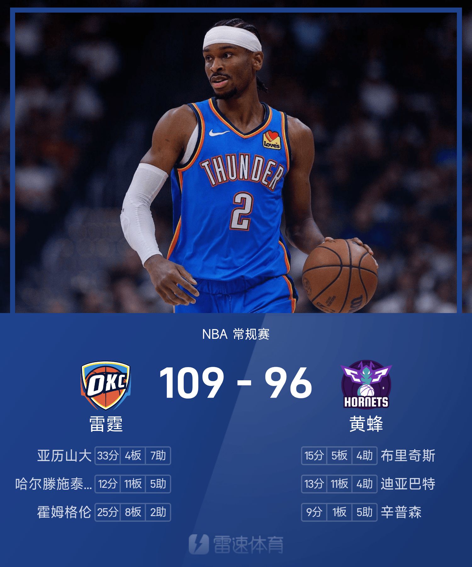 Alexander ghi được 33 điểm cao nhất trận, 4 rebound và 7 kiến tạo, đưa Thunder đến chiến thắng.