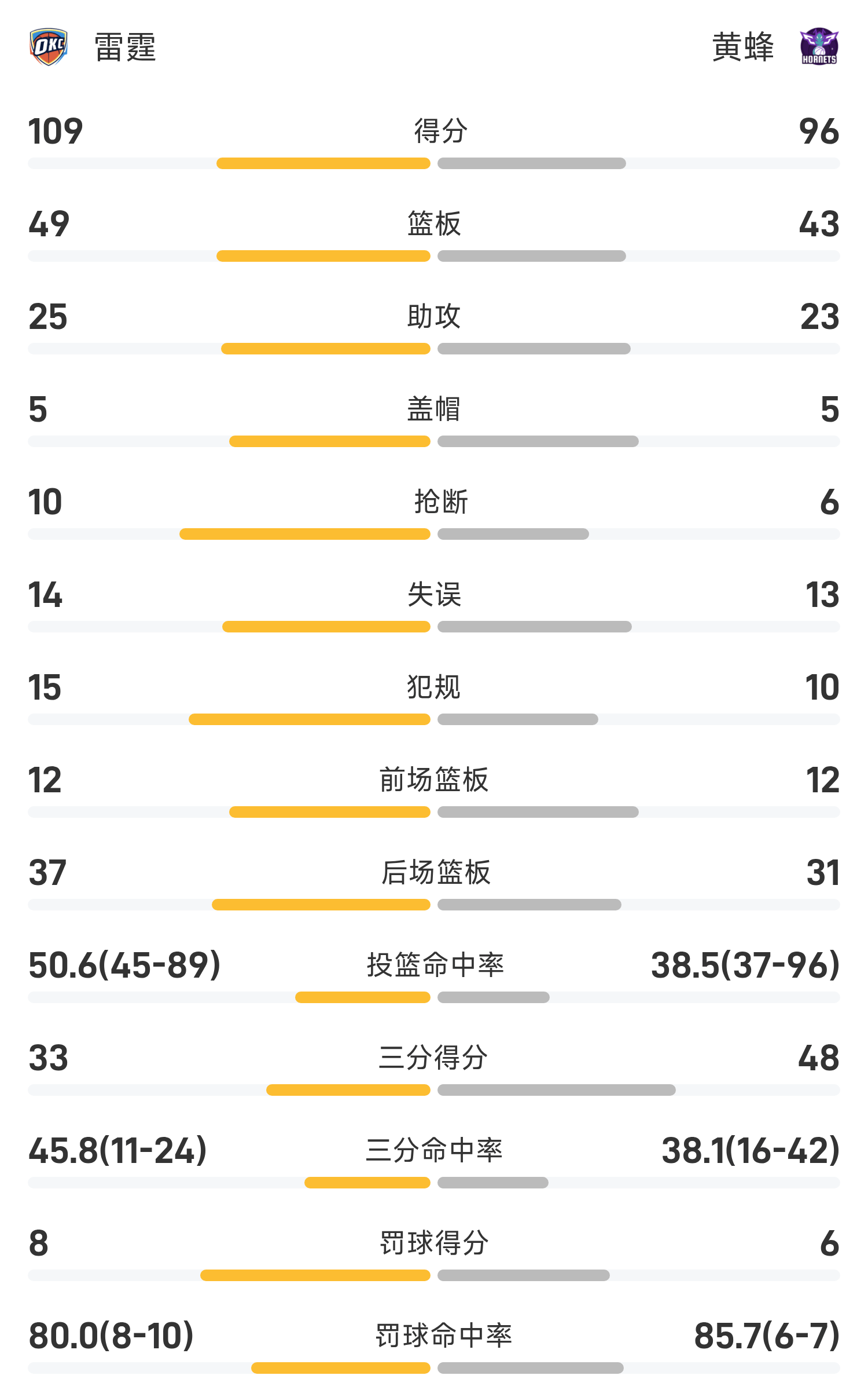 Cuối trận, Hornets thua Thunder với tỷ số 96-109.
