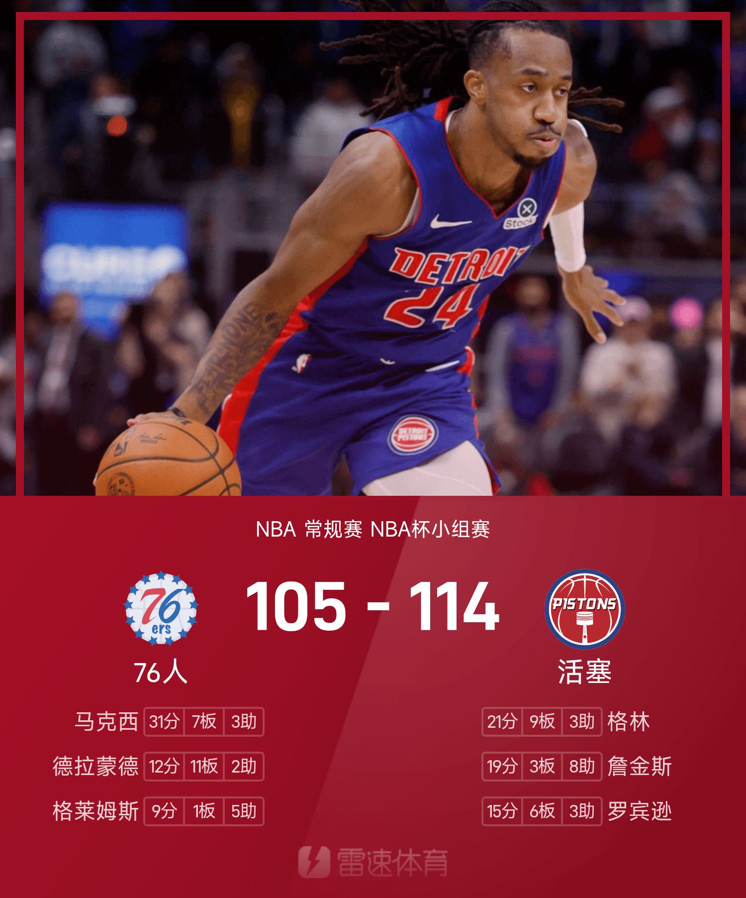 Báo cáo NBA Cup: Jenkins có 19 điểm và 8 kiến tạo, Pistons đánh bại 76ers 114-105