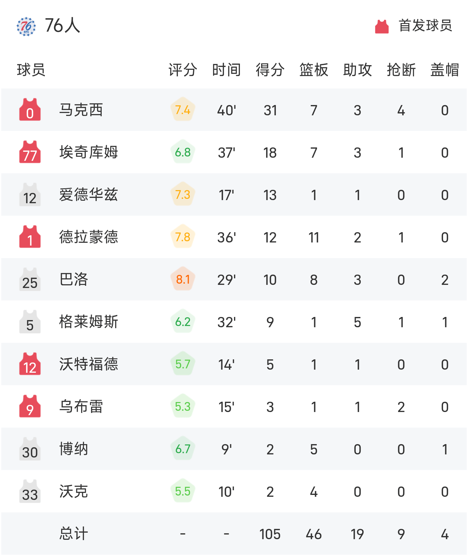 6686 Thể thao Tin tức ngày 15 tháng 11 Trong trận đấu vòng bảng NBA Cup mùa giải thường lệ 25/26, đội Pistons đối mặt với 76ers. Kết thúc trận đấu, Pistons đánh bại 76ers với tỷ số 114-105. Green ghi 21 điểm, 9 rebound và 3 kiến tạo để dẫn dắt đội đến chiến thắng. Maxi ghi được 31 điểm cao nhất trận, 7 rebound và 3 kiến tạo.