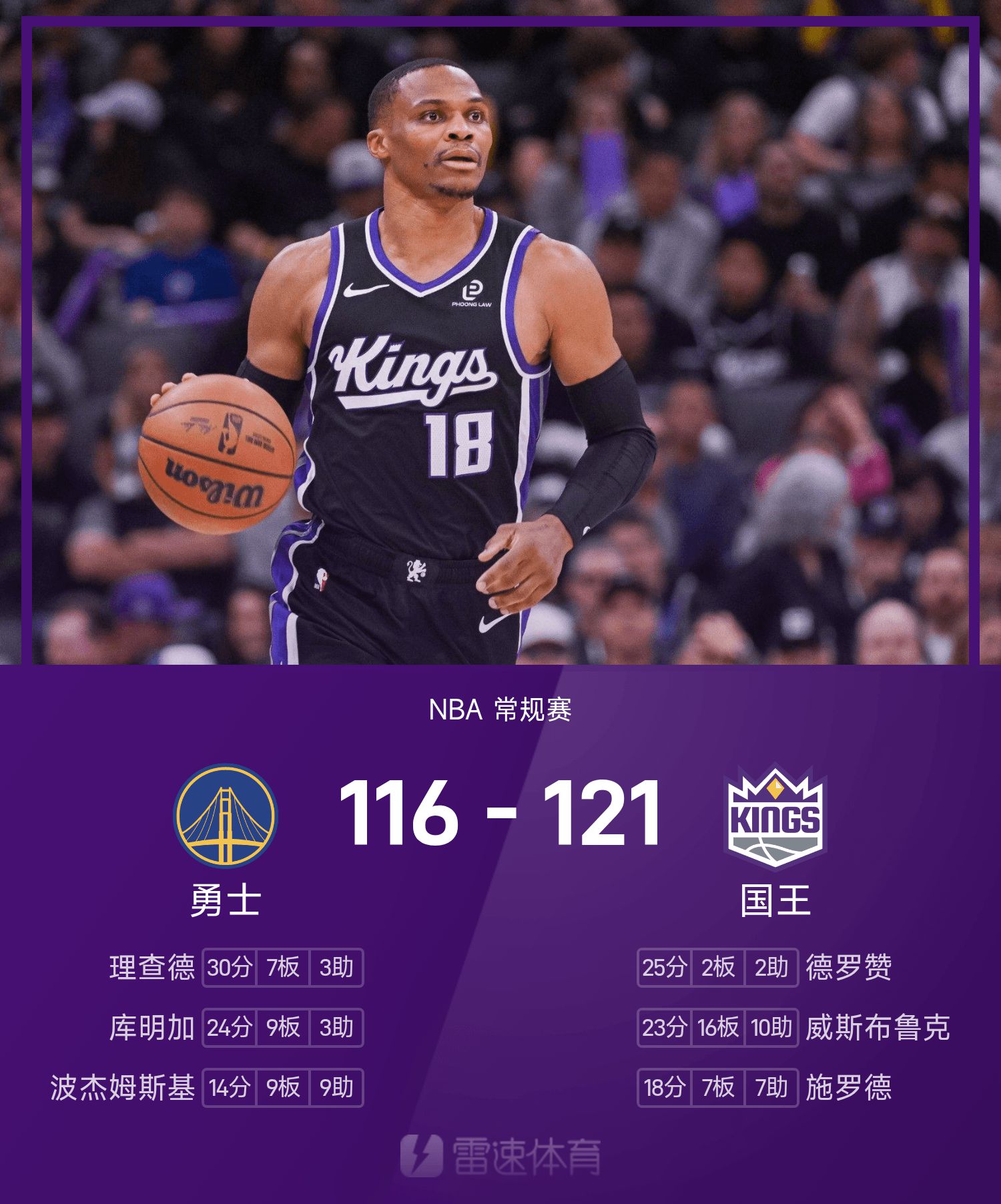 Báo cáo trận chiến NBA: Westbrook nhân ba lần và đánh chặn quan trọng, Kings đánh bại Warriors 121-116