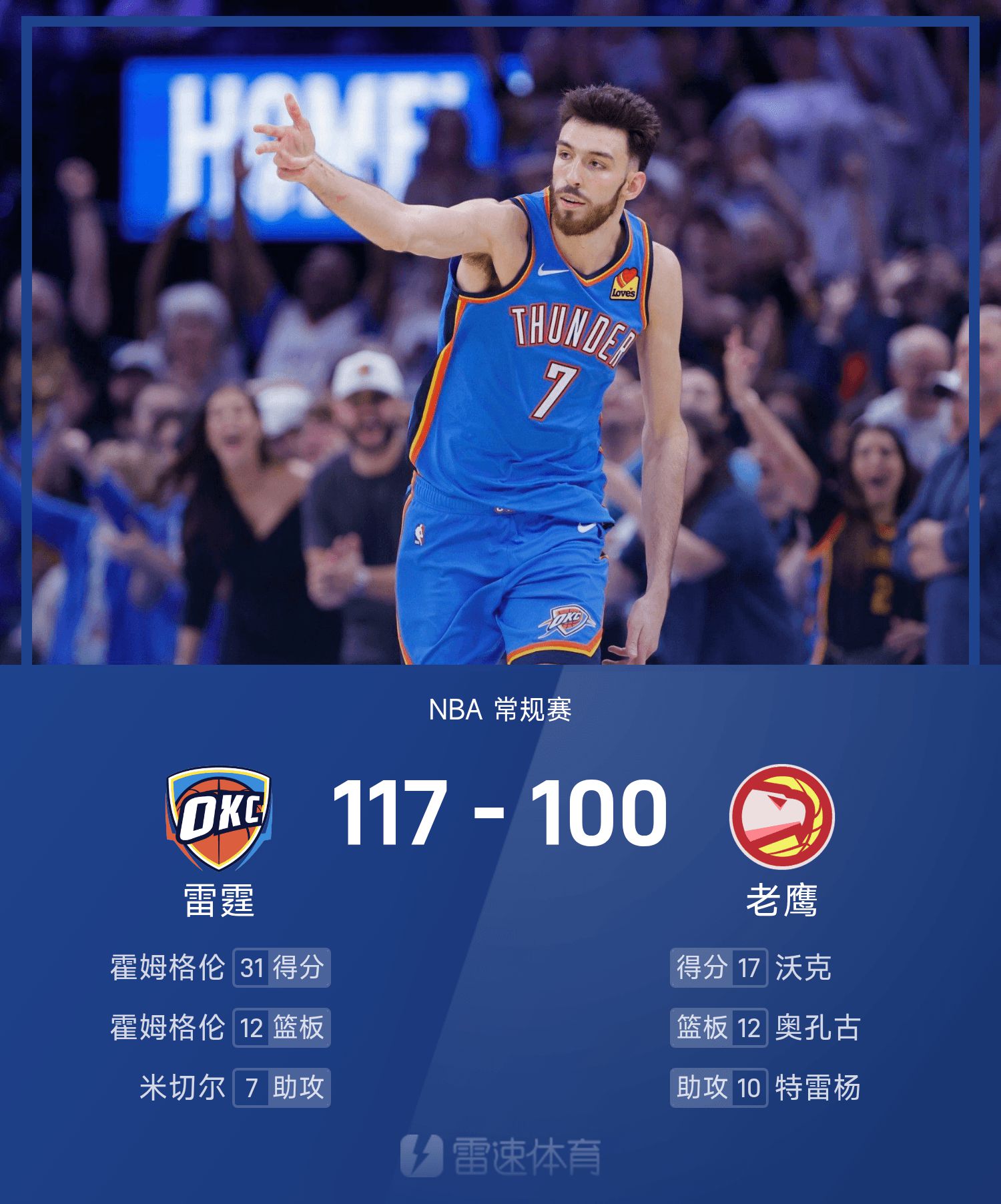 Người trong cuộc Thunder Chet Holmgren tung ra 6 quả ba điểm và ghi được 31 điểm, 12 rebound và 3 lần đánh chặn; Thunder core Alexander ghi được 30 điểm, 4 rebound và 5 kiến tạo chỉ với 4 quả ném phạt. The Thunder khởi đầu mùa giải với 3 chiến thắng liên tiếp nhờ màn trình diễn chói sáng của 2 ngôi sao.