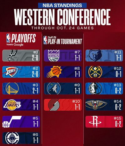 Hiện tại, sau hai trận đầu tiên của mùa giải mới, Rockets, Mavericks và Pelicans đều khó thắng và xếp cuối cùng ở Western Conference, trong khi Spurs và đương kim vô địch Thunder dẫn đầu Western Conference với thành tích 2 thắng và 0 thua.